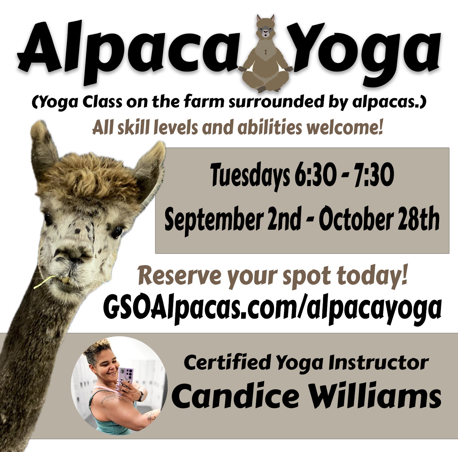 Candice Williams is a certified yoga teacher whose personal transformation inspires everyone she meets. Once weighing nearly 500 pounds, she lost almost 300 through determination, movement, and mindfulness. Yoga became the practice that not only strengthened her body but also brought light, joy, and balance into her life. Today, she shares that same positivity and welcoming spirit in every alpaca yoga class—helping students connect with themselves, nature, and a few furry friends along the way.